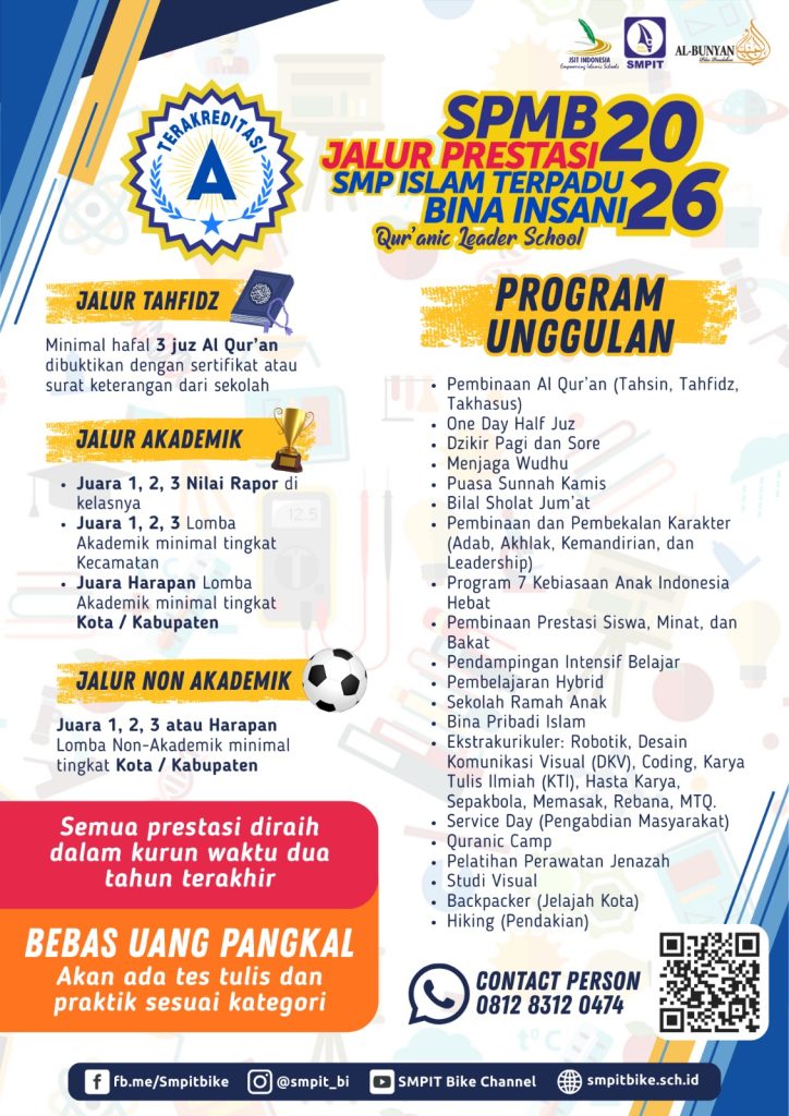 SPMB (Sistem Penerimaan Murid Baru) SMP Islam Terpadu (IT) Bina Insani Kediri merupakan proses seleksi resmi bagi calon siswa baru yang ingin bergabung dengan lembaga pendidikan berbasis nilai Islam dan karakter Qur’ani di bawah naungan Yayasan Bina Insani Kediri.