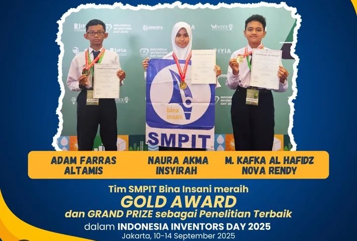 Ketiganya tidak hanya berhasil meraih Gold Award (Internasional), tetapi juga dianugerahi Grand Prize sebagai Penelitian Terbaik di kompetisi bergengsi ini. Prestasi ini merupakan lomba prestasi yang sangat membanggakan karena menunjukkan kualitas penelitian dan inovasi siswa sekolah ini setara dengan standar internasional. Keberhasilan ini semakin memperkuat posisi SMPIT Bina Insani Kota Kediri sebagai institusi pendidikan yang tidak hanya fokus pada kurikulum formal, namun juga mendorong siswa untuk berinovasi dan menghasilkan karya nyata yang bermanfaat bagi masyarakat.