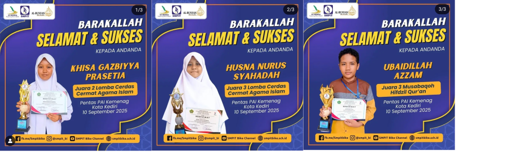Khisa Gazbiyya Prasetya, siswa kelas IX, berhasil meraih Juara 2 Lomba Cerdas Cermat Agama Islam (CCA). Diikuti oleh, Husna Nurus Syahadah, yang mengamankan posisi Juara 3 CCA. Prestasi ini mencerminkan tingginya kualitas pembelajaran Pendidikan Agama Islam di sekolah. Tidak ketinggalan, Ubaidillah Azam turut mengharumkan nama sekolah dengan meraih Juara 3 Musabaqah Hifdzil Qur’an (MHQ). Pencapaian ini menegaskan bahwa pembinaan spiritual dan kemampuan menghafal Al-Qur’an di SMPIT Bina Insani Kota Kediri berjalan optimal.