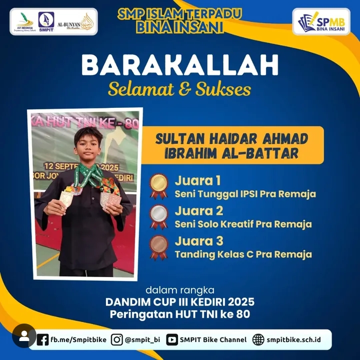 SMPIT Bina Insani Kota Kediri kembali menegaskan komitmennya dalam mencetak generasi berkarakter unggul dan berprestasi. Pada bulan September 2025, delapan orang siswa dari sekolah ini berhasil menorehkan tinta emas melalui serangkaian lomba prestasi yang diselenggarakan baik di tingkat kota, regional, maupun internasional. Prestasi ini bukan sekadar pencapaian individual, melainkan bukti nyata keberhasilan implementasi program pendidikan holistik yang memadukan kecerdasan spiritual, intelektual, dan fisik.